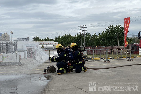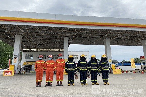 随后,演练组深入辖区泾干大道加油站开展六熟悉演练行动。演练开始前,队员们对加油站的灭火预案进行了熟悉,并在单位负责人的带领下对加油站重点部位和消防设施进行了了解。演练假设加油站因员工操作不当引发的火灾。接到报警后,泾干小型站立即出动2辆消防车、10名消防队员赶赴现场处置。指挥员根据现场情况,命令攻坚组关闭输油管阀门,同时在加油区和油罐区设置水枪阵地,并出一支水枪对起火部位进行覆盖。整个演练过程中,战斗展开迅速,次序有条不紊,班组配合密切,指挥得当,达到了预期的演练效果。