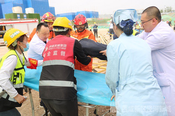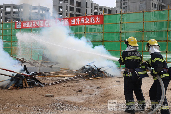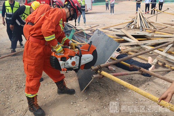 演练假设:“西咸崇文庄园项目二期工地发生坍塌,现场木质板着火”。崇文小型站迅速出动一车5人前往现场进行处置,到达现场后,经侦查发现工地现场模板发生坍塌并起火,造成三人受伤,一人被困,指挥员立即下令对现场外围进行警戒,一名队员则使用无齿锯进行切割,成功将被困人员救出,两名队员出一支干线对火势进行压制,10余分钟过后,火势逐渐熄灭。演练完毕,指挥员对此次演练进行了讲评,并针对此次演练提出了几点具体要求:一是无论演练还是出警过程中首先要注重安全,加强自身防范;二是对个人防护装备细致检查,确保自身安全;三是强化作战协同意识,保证作战行动迅速有效。