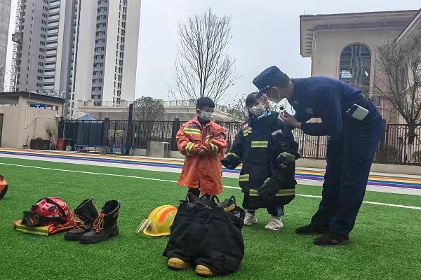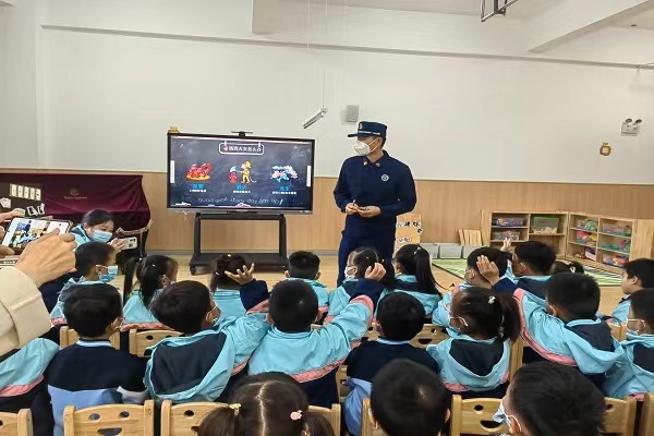 首先宣讲员运用通俗易懂的语言,深入浅出地讲解了火灾来临时小朋友如何正确报警、安全逃生、火灾的危险性等消防安全知识,教育小朋友们不要玩火,一旦发生火灾要及时拨打“119”报警电话并迅速逃离火灾现场。现场还采取有奖问答、互动小游戏等方式,加深孩子们对课堂上所学消防知识的印象。接下来,进行了消防器材的讲解,孩子们进行了消防车、消防器材的参观,还亲身体验了消防服。使孩子们更加深刻的了解了消防知识。最后,给幼儿园的老师、工作人员讲解和演示了消火栓、灭火器的使用方法和注意事项,加强自身消防安全知识、能力的提高。