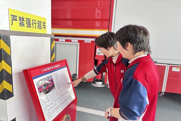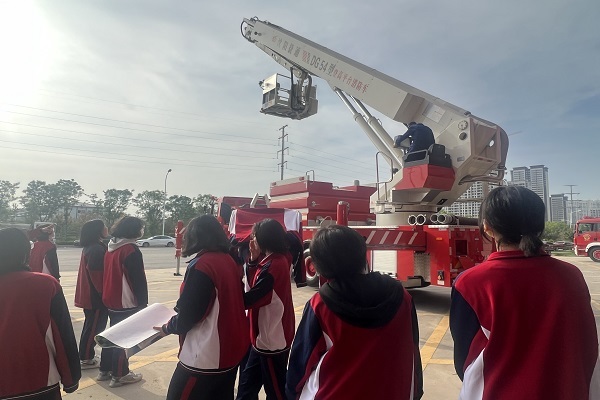 过程中,消防救援人员带领师生们参观了执勤车辆及器材装备,用通俗易懂的语言详细讲解了车辆的名称、性能、用途和器材配备。同学们在消防救援人员的帮助下,积极踊跃地体验战斗服、消防水枪等各种消防装备器材,同时,消防救援人员通过问答的方式,让同学们在活跃的互动中了解了如何正确拨打119,如何在危险情况下进行自救,如何查找生活中的安全隐患等知识。