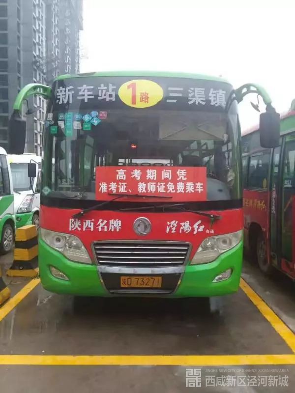 高考期间(6月6日-6月8日),考生可凭准考证携两名家长、教师凭教师证在泾河新城范围内免费乘坐1路、2路、3路、6路、7路、8路、9路、11路、16路和21路公交车,并享受免费红茶等饮料服务。