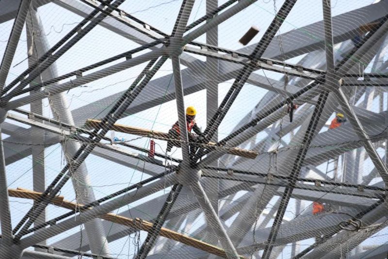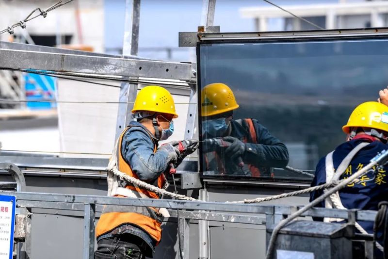 3月24日,泾河新城体育中心项目的工地上,工人们正在进行外部幕墙玻璃、金属吊顶及各类管网的施工安装工作。