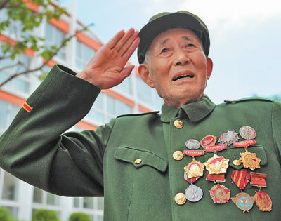 年近期颐,褶皱的脸上写满岁月的痕迹,但每当国歌和军歌旋律响起,老人总是目含敬意,深情致以军礼。这一刻,老战士神采奕奕。