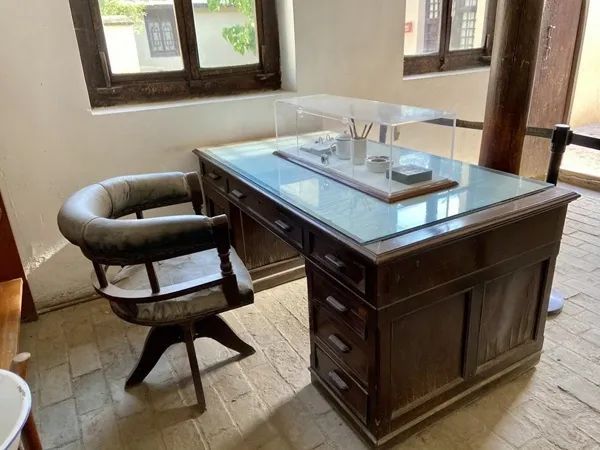 在西柏坡中共中央旧址毛泽东旧居的办公室里,一套棕色木质办公桌椅临窗而放。桌上摆放着砚台、笔筒等物品,与之配套的转椅为四足圈式椅,由于年代久远,已略显破旧。70多年前,毛泽东就是在这里为了中国革命夙兴夜寐、决胜千里,赢得解放战争的决定性胜利。
