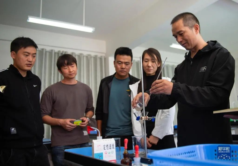 北京市援青支教教师、来自通州区陆辛庄学校的化学教师祁生贵(右一)在青海省玉树州第四民族高级中学指导学校教师进行实验教学(2020年8月12日摄)。新华社记者 陈钟昊 摄