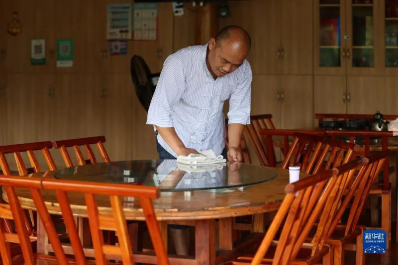 在湖南省湘西土家族苗族自治州十八洞村,杨正邦在自家农家乐打扫卫生(2022年7月2日摄)。新华社记者 薛宇舸 摄