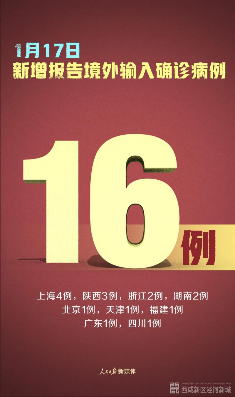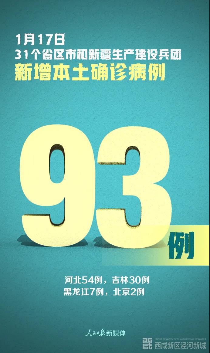 1月17日0—24时,31个省(自治区、直辖市)和新疆生产建设兵团报告新增确诊病例109例,其中境外输入病例16例(上海4例,陕西3例,浙江2例,湖南2例,北京1例,天津1例,福建1例,广东1例,四川1例),本土病例93例(河北54例,吉林30例,黑龙江7例,北京2例);无新增死亡病例;新增疑似病例2例,均为境外输入病例(均在上海)。
