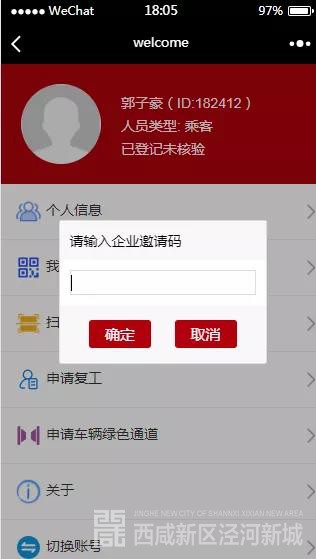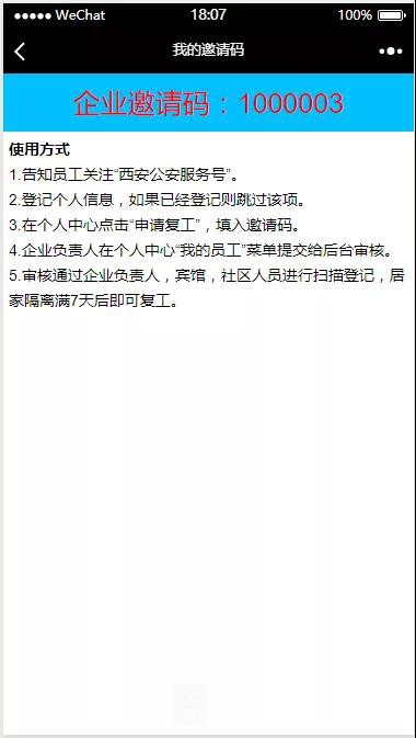 负责人应将“企业邀请码”发给本企业所有返程复工员工。每位员工从“企业复工申请登记入口”进入后选择“员工申请”,在填报完个人信息后,应在微信公众号“西安公安服务号”主页面点击“我的”选项,在“个人中心”选择“申请复工”。