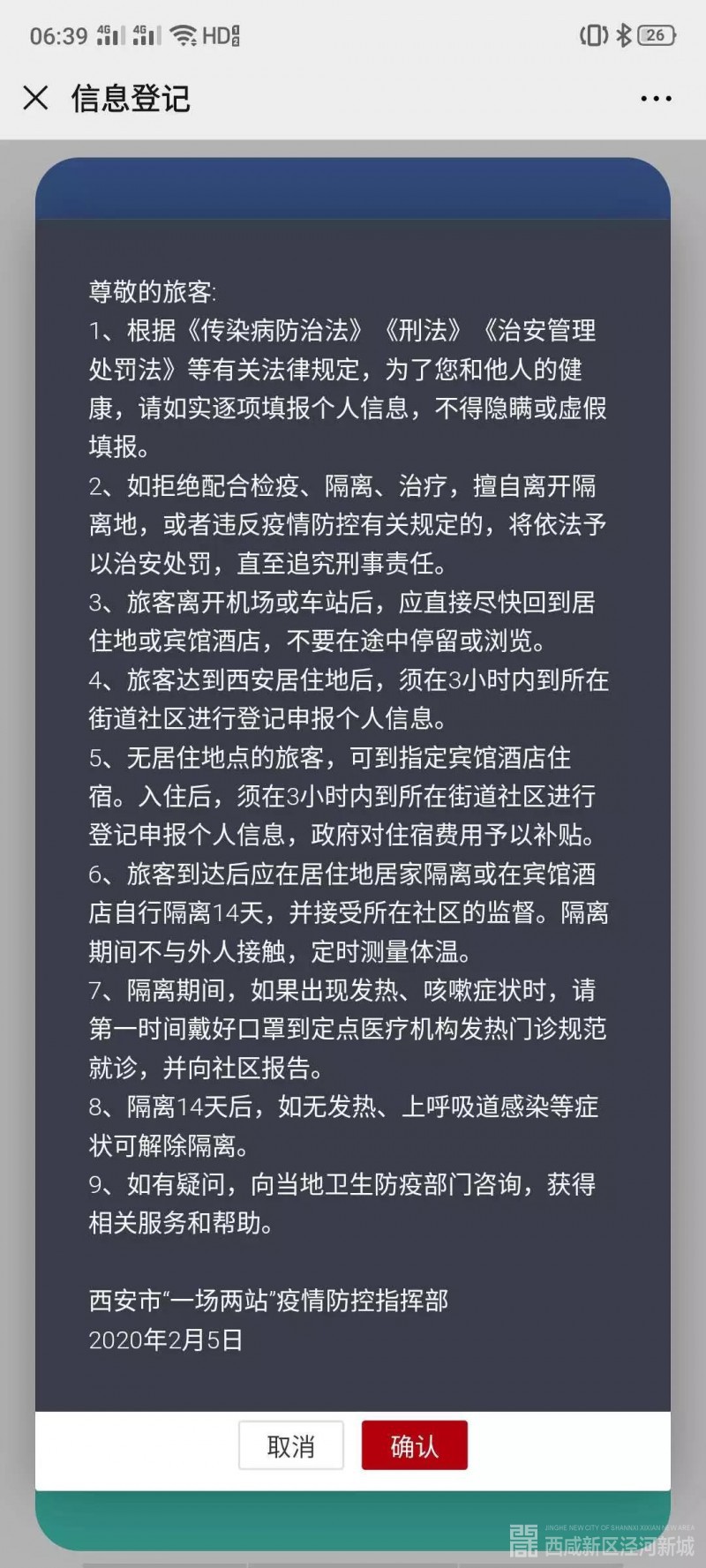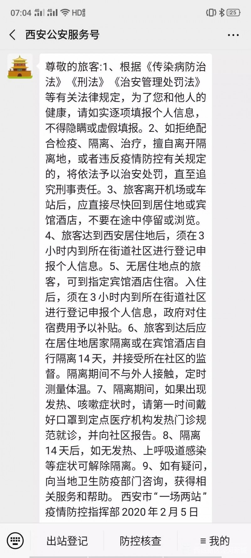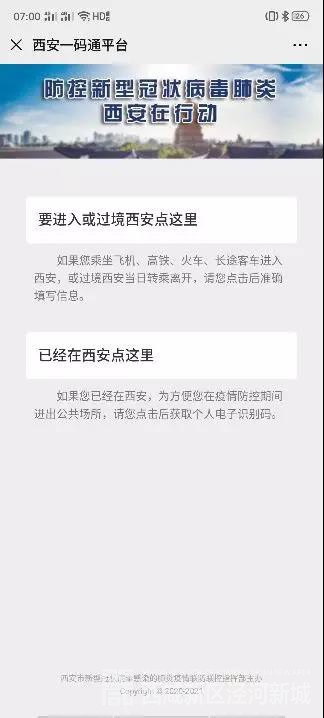 2月21日中午12时开始,所有外来和返回西安人员,无论采取何种交通方式,均可采用在出发前微信扫码关注公众号“西安公安服务号”(或扫描西安“一码通”二维码)的方式,登录“西安疫情防治网格化管理系统”填报个人信息。同时,系统还专门增加了复工登记申请通道,为广大企业提供更多便利。