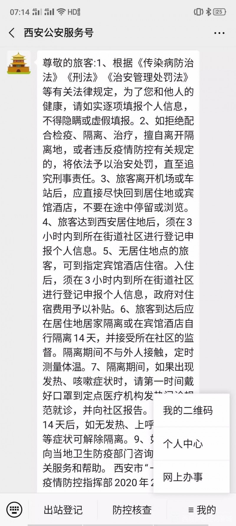 提示:在出机场、火车站、高铁站、长途客运站或通过检查站进入西安之前,请提前准备好身份证,并在手机上调出个人专属二维码,供公安民警扫描审核。(市内跨区县长途客运出站旅客,需向民警展示车票和身份证,经核验后方可出站)