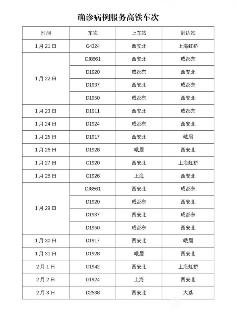 2020年2月9日,渭南市澄城县新冠肺炎确诊病例王某某系高铁公司保洁员。发病前曾在以下20趟高铁动车服务,目前患者已在定点医院治疗。乘同车次的人员均为密切接触者。
