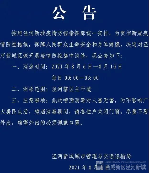 本次消杀工作由指挥部交通运输组、疫情防控和医疗救治组、各镇、市场主体监督组、物资保障组、监督检查组共同组织实施,对泾河新城辖区公共区域、公共交通道路、公共交通工具、农贸市场、商场超市、建设项目工地、景区、学校、卫生院等进行一次全面彻底消毒。覆盖面积大,预计在8月10日结束整体消杀工作。