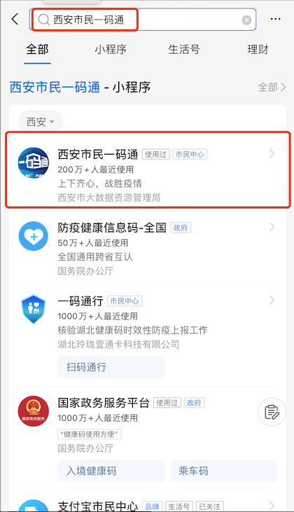 打开支付宝,在搜索栏输入“西安市民一码通”,进入小程序。
