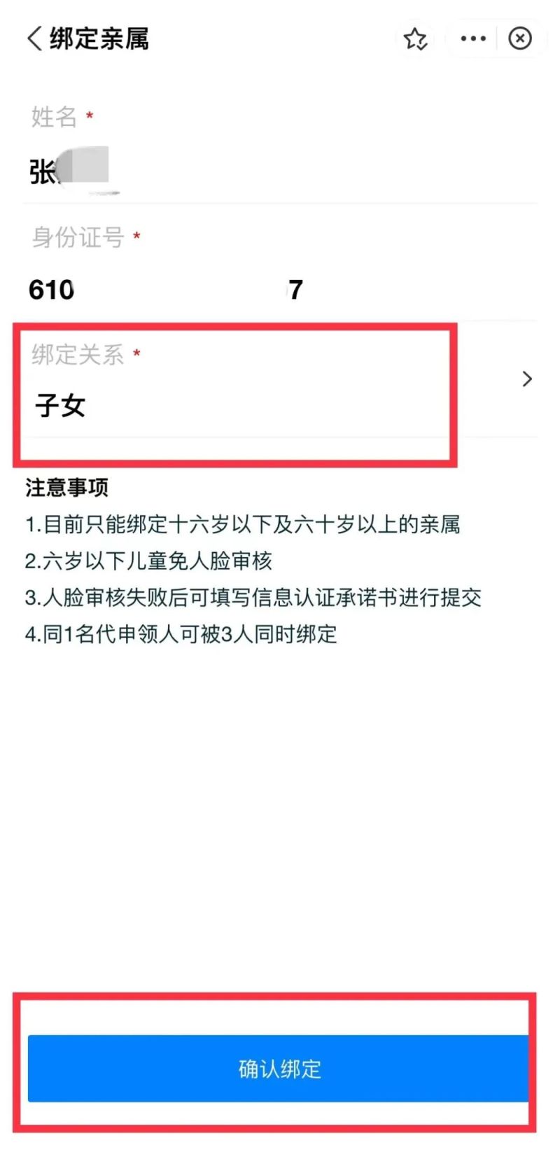 输入需要绑定亲属的姓名、身份证号后,点击“绑定关系”进行选择,完成后点击“确认绑定”