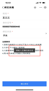 温馨提示:您输入的亲属身份证号错误,系统将提示“请输入正确的身份证”,如果您亲属年龄在17-59岁之间,系统将提示“暂时只支持绑定16岁以下及60岁以上的亲属”,均不能申领使用亲属码。