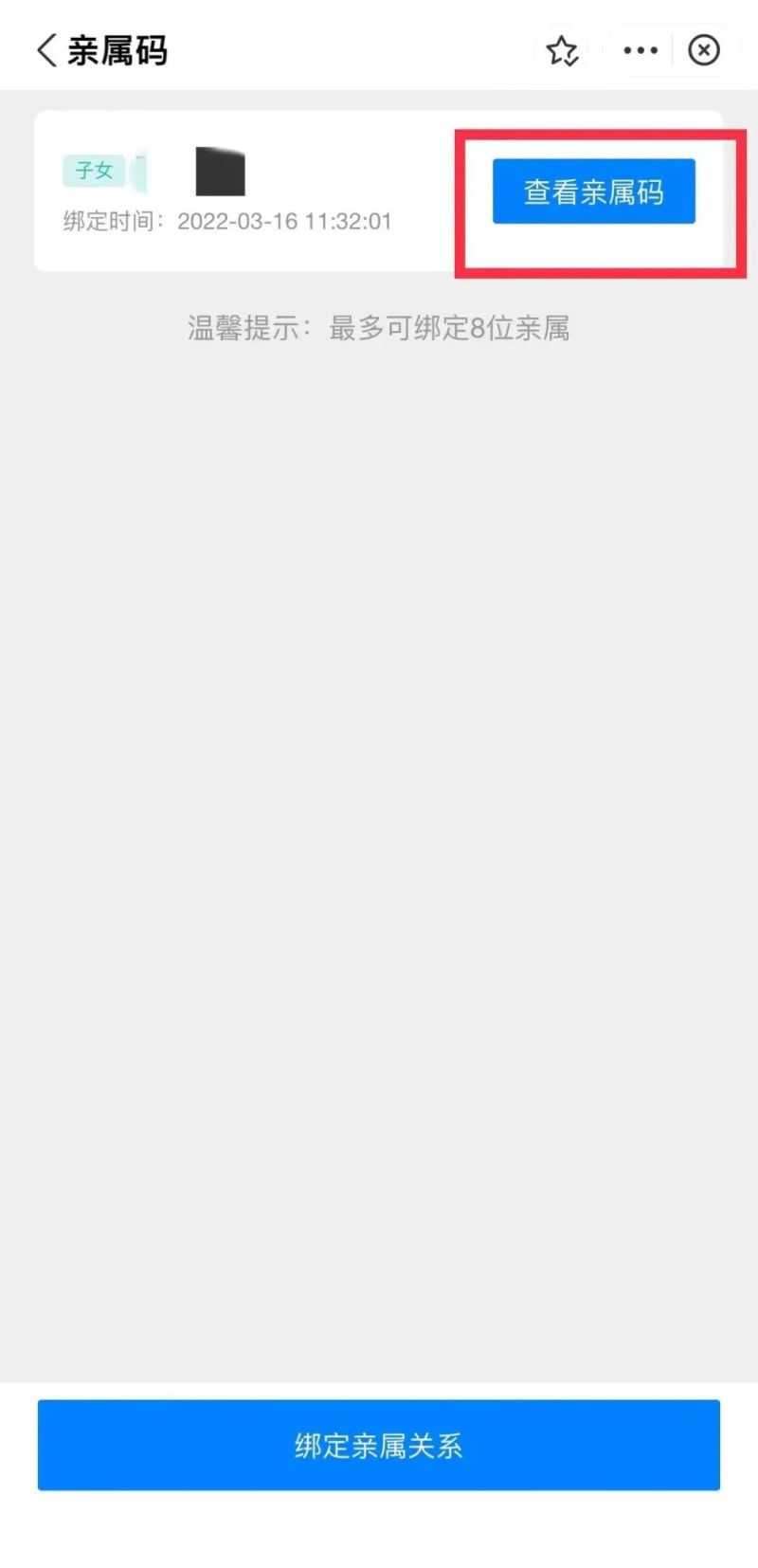完成认证后,自动返回绑定亲属关系页面完成绑定,可点击“查看亲属码”进行查看