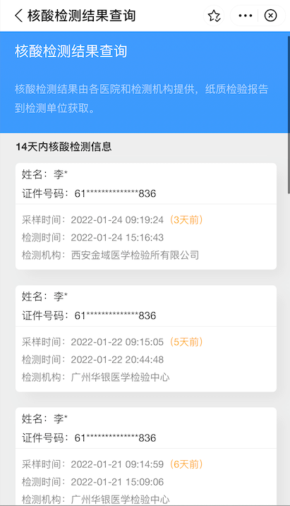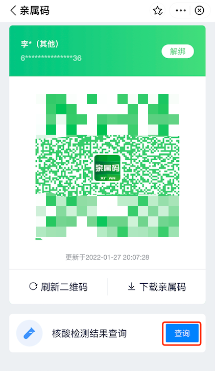 在做核酸检测时,可展示亲属码为亲属进行核酸检测信息登记,检测后,可点选“查询”,查看核酸检测结果。