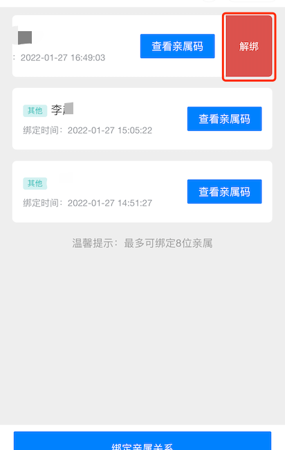 提示:绑定亲情码成员24小时后,才能进行解绑操作哦。
