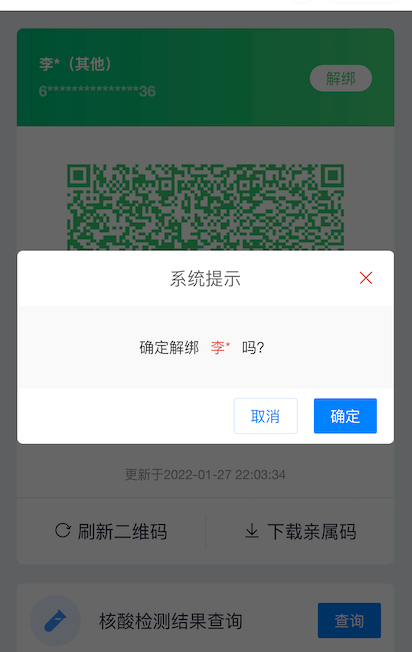 亲属码支持解除绑定的功能,可在亲属码列表滑动解绑,也可在亲属码展示界面点击“解绑”解除绑定。