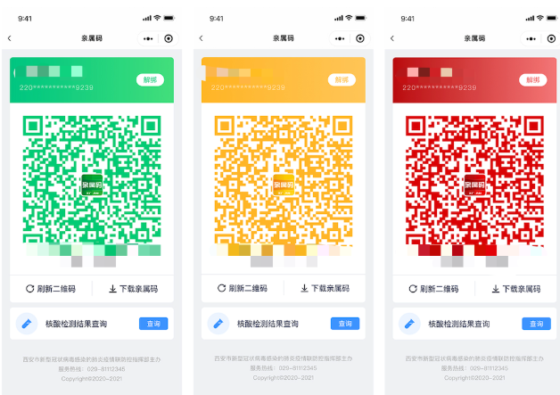 亲属码的红、黄、绿三色与一码通个人电子健康码赋码规则一致,都是经过综合分析评估后,测算出红色、黄色、绿色三种状态,旨在为居民自我预防和工作生活提供服务。