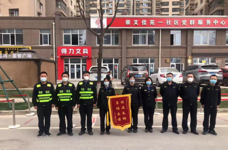 3月15日上午,崇文佳苑小区居民代表将一面写有“抗疫先锋 勇往直前”的锦旗送到坚守在全民核酸筛查点上执勤的执法队员手中,感谢泾河执法铁军在疫情防控期间不分昼夜、冲锋在前,用坚守和付出为人民群众筑牢疫情防控的坚强堡垒。