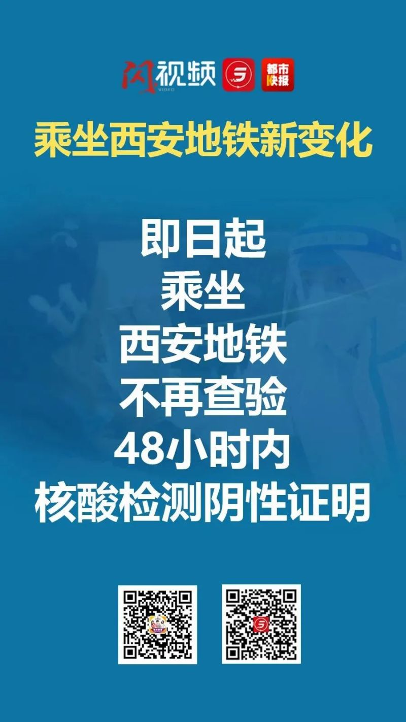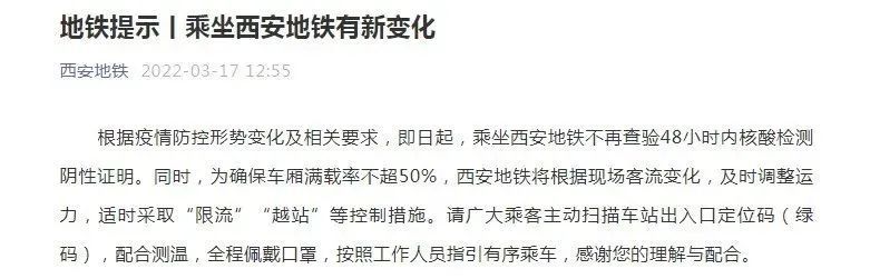 根据疫情防控形势变化及相关要求,即日起,乘坐西安地铁不再查验48小时内核酸检测阴性证明。同时,为确保车厢满载率不超50%,西安地铁将根据现场客流变化,及时调整运力,适时采取“限流”“越站”等控制措施。请广大乘客主动扫描车站出入口定位码(绿码),配合测温,全程佩戴口罩,按照工作人员指引有序乘车,感谢您的理解与配合。