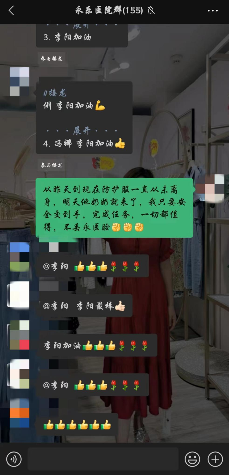 “大家都很棒,特别是张乐和李阳同志是大家学习的楷模。”在二人轮班照顾小朋友期间,房间外的其他医护人员也在微信群里不断为他们加油打气,让他们深受鼓舞。