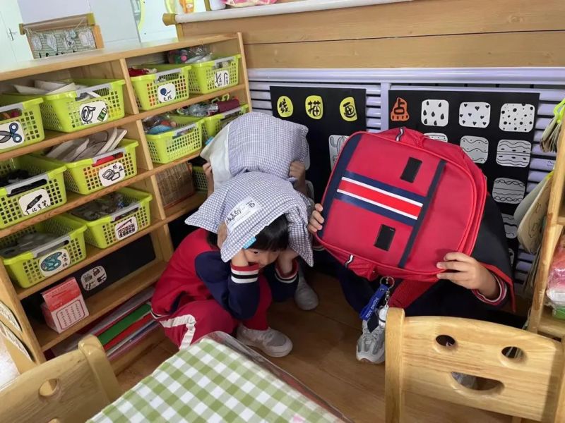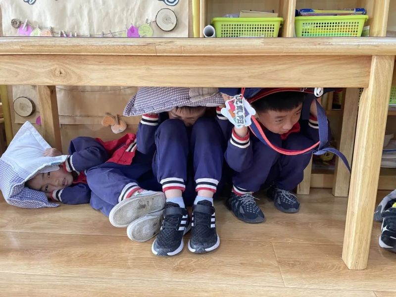 “呜……呜……”广播中拉响了第一次防震警报声,各班老师在告知、安抚幼儿“地震来了,不要慌”的同时,迅速组织幼儿快速躲到就近“安全三角区”,蜷缩身体,降低重心,双手护头,进行躲避。