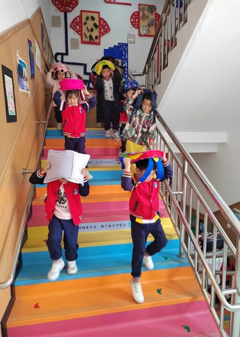 “呜……呜……”当警报第二次响起时,各班老师告诉幼儿,地震已过,为了防止有较大的余震发生,立刻组织幼儿用枕头保护好头部,沿着预定疏散路线,快速有序地撤离教室,从安全通道快速撤离至户外空旷、安全地带。