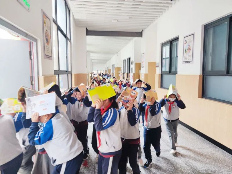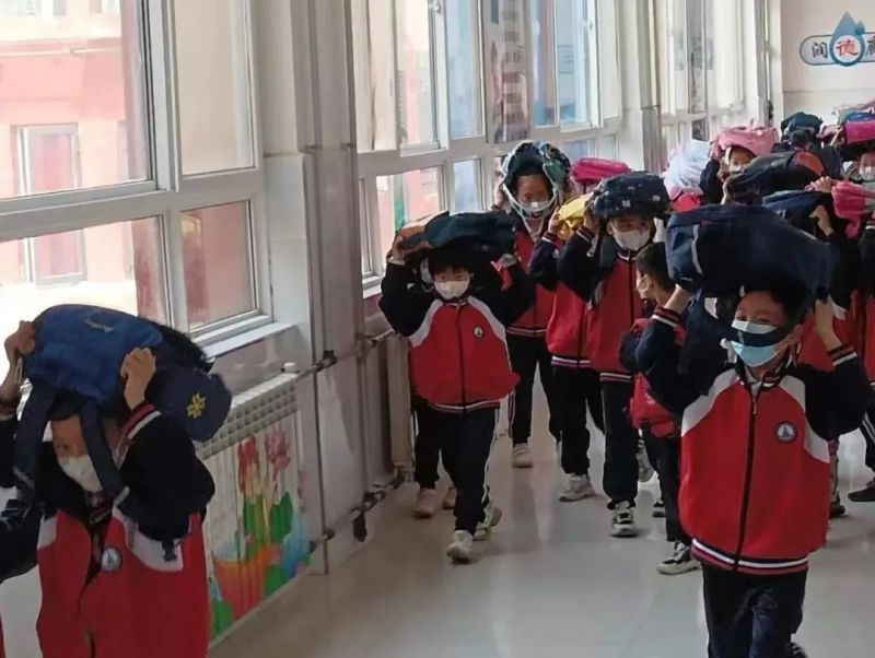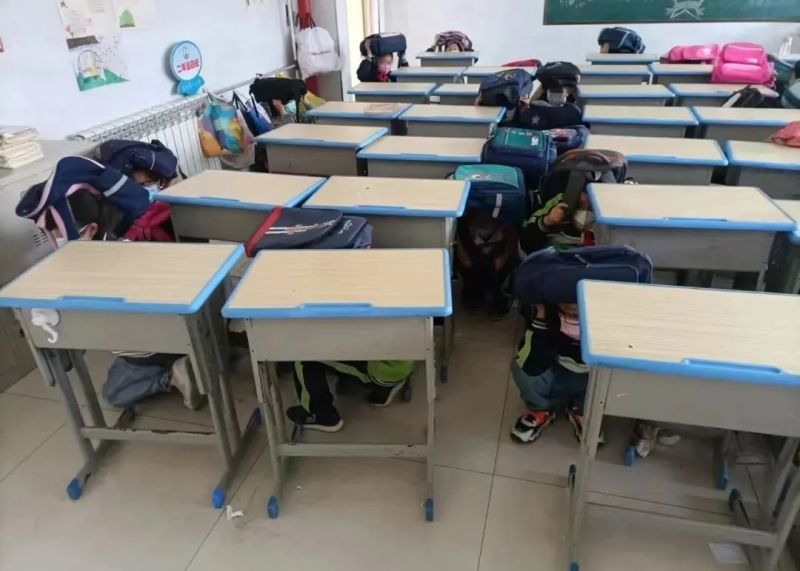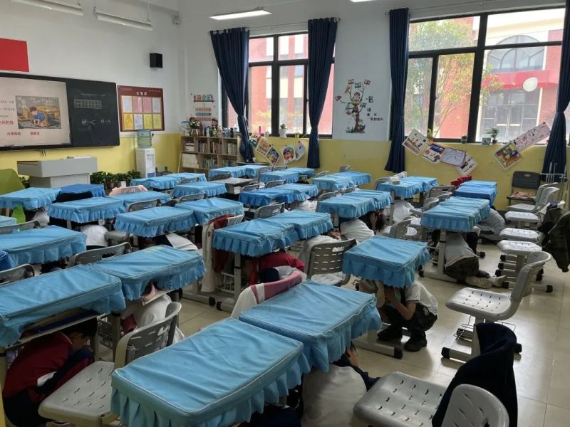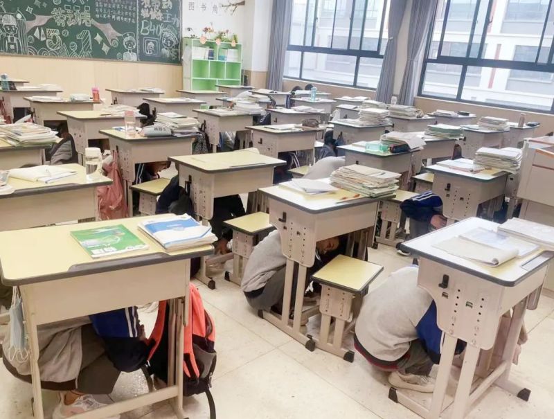 下午16时,随着警报声响起,演练正式拉开帷幕。一二层楼学生在老师的带领下疏散至安全区域。高楼层学生迅速躲避至室内桌面下、教室内安全三角区,待情况相对稳定后,以双手抱头的姿势,按预定的路线,在老师的组织下及时进行疏散。