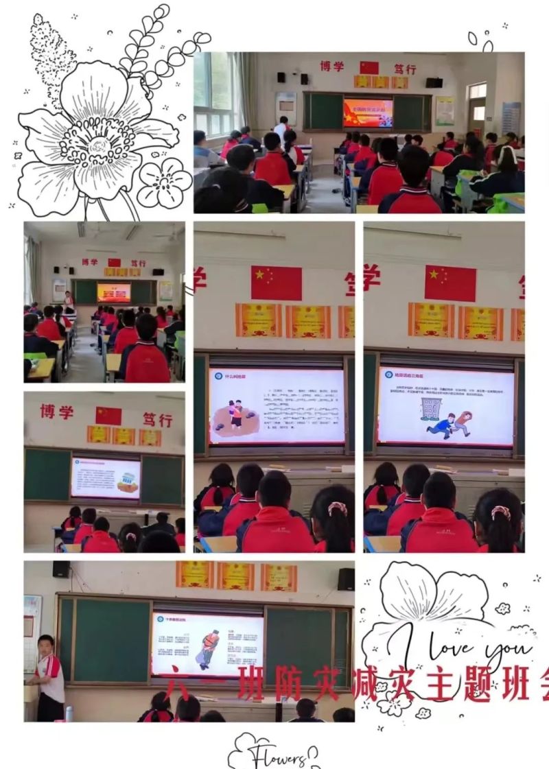 本次主题班会主要从常见的自然灾害、防灾减灾的意义、认识地震和逃生演练四个板块进行开展。各班班主任充分利用多媒体课件,图文并茂地给学生讲解地震发生前地下水和动物的异常征兆,当地震发生时在不同场地的防护要点,地震时被压埋了该如何自救,震后的施救措施等。