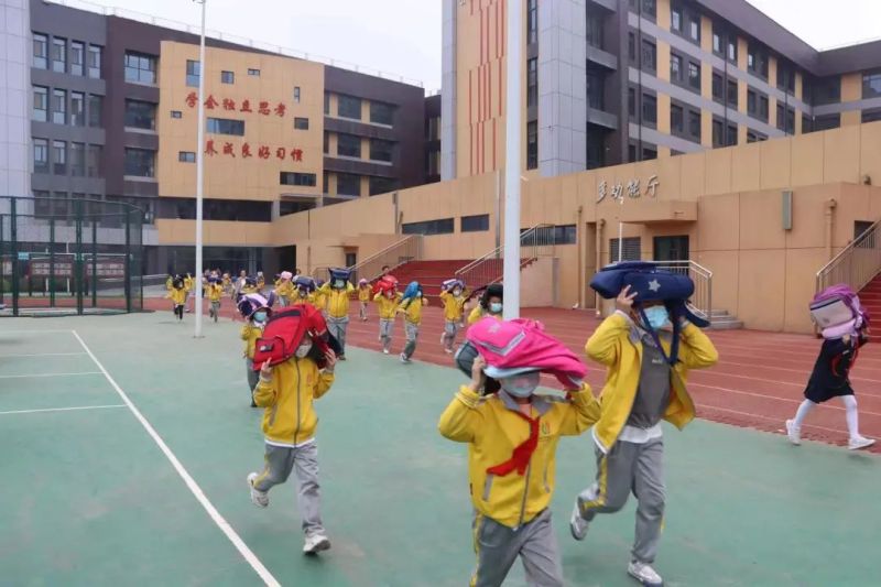 随后9时10分,校园广播发送第二次防震警报,听到警铃声后,各班主任、任课教师按照演练预案紧急组织学生疏散,学校安全疏散组人员、医疗救护组人员迅速就位。学生在各班主任和疏散组人员的指引下紧张有序撤离教学楼。同学们使用书包、书本等遮挡物保护头部,低势行进,弯腰按指定路线有序的向学校操场疏散撤离。疏散完成后,各年级组长检查学生撤离情况,并向总指挥汇报各年级已撤离人数。