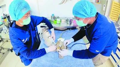 北京猛禽救助中心的康复师在给长耳鸮治疗 光明图片