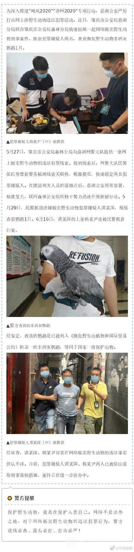 为深入推进“飓风2020”“净网2020”专项行动,鼎湖公安严厉打击网上涉野生动物违法犯罪活动。近日,肇庆市公安局鼎湖分局联合肇庆市公安局森林分局快速侦破一起网络贩卖野生动物刑事案件,抓获犯罪嫌疑人2名,查获濒危野生动物非洲灰鹦鹉1只。