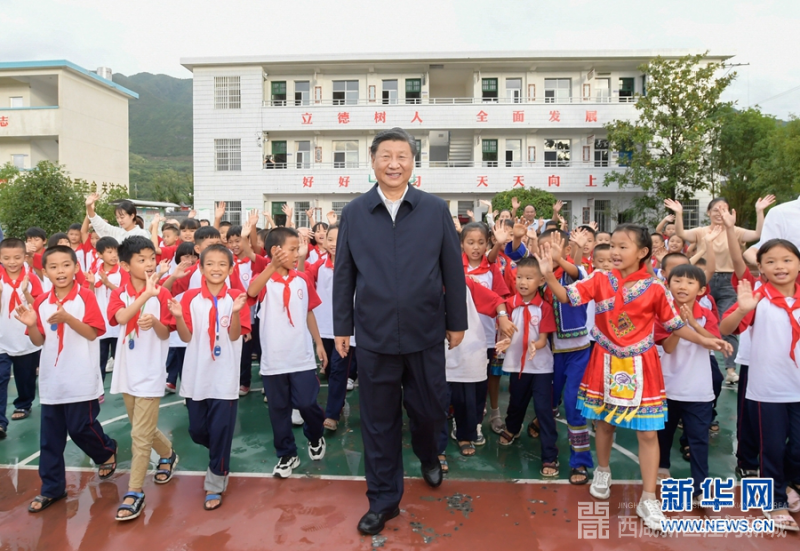 2020年9月16日至18日,中共中央总书记、国家主席、中央军委主席习近平在湖南考察。这是16日下午,在郴州市汝城县文明瑶族乡第一片小学,师生们簇拥着习近平步出校园。新华社记者 李学仁 摄