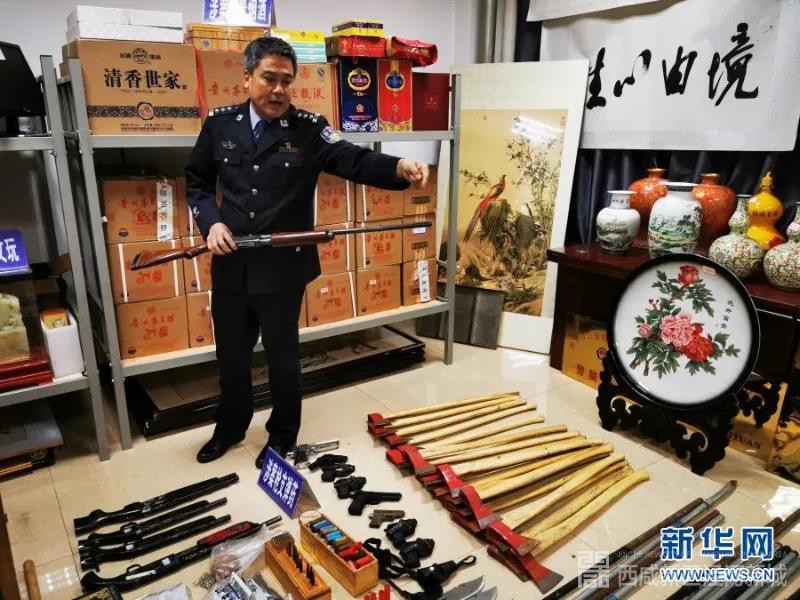 陕西省武功县公安局局长李宁展示以蔡国强等人为首的黑社会性质组织案件中的一把涉案枪支(2020年11月5日摄)。