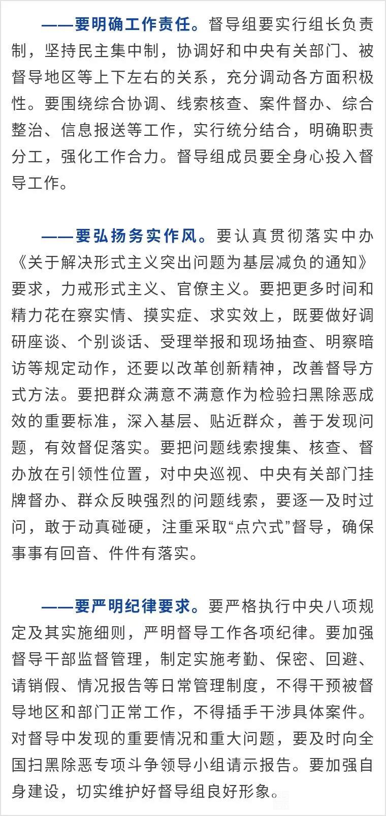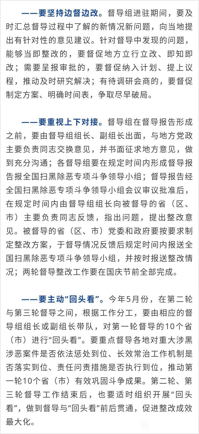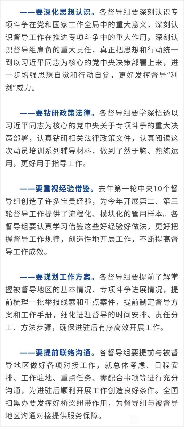 陈一新首先通报了中央扫黑除恶第二轮、第三轮督导工作具体安排:今年上半年,组建11个中央督导组,对21个省(区、市)及新疆生产建设兵团的扫黑除恶专项斗争开展督导,实现督导工作全覆盖。