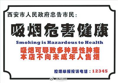 【西安制定禁烟标识制作标准场所控烟不力罚款500-1000元】根据《西安市控制吸烟管理办法》有关条款规定,市爱卫办日前制定了《西安市禁止吸烟标识制作标准与张贴规范》。记者获悉,通用禁烟标识为在本市禁止吸烟基本图形警示标识基础上,标注中英文“禁止吸烟 No smoking”“控烟举报投诉电话:12345”和“违者罚款10元,场所控烟不力,罚款500-1000元。”室外吸烟区必须在显著位置设置醒目的吸烟危害健康警示标识或者图片。各单位可根据吸烟区情况自行设计制作吸烟危害健康宣传区。控制吸烟场所的经营者、管理者应当在场所出入口及其他显著位置设置明显的禁止吸烟标识和举报、投诉电话。