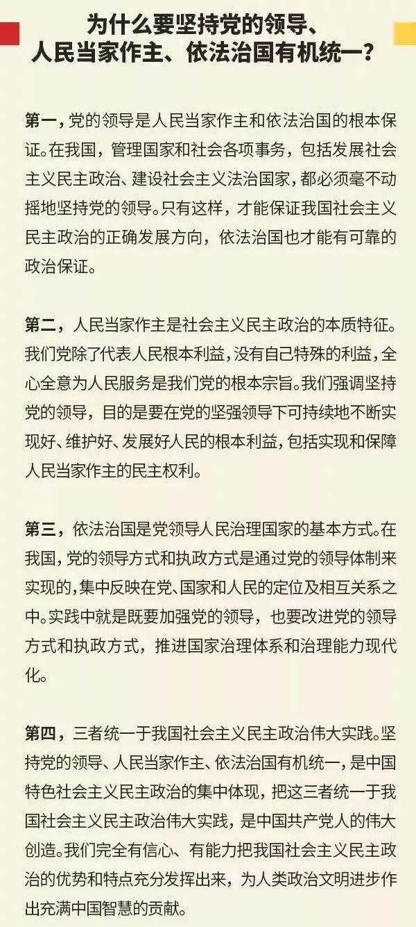 习近平总书记在党的十九大报告中指出:“党的领导是人民当家作主和依法治国的根本保证,人民当家作主是社会主义民主政治的本质特征,依法治国是党领导人民治理国家的基本方式,三者统一于我国社会主义民主政治伟大实践。”为什么要坚持党的领导、人民当家作主、依法治国有机统一?
