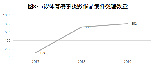 在侵犯著作权纠纷案件中,主要以涉及侵犯体育赛事摄影作品及文字作品著作权案件为主。其中受理涉及体育赛事摄影作品的案件有1632件,且数量呈爆发式增长态势,占侵犯著作权纠纷案件的86.95%,占全部涉体育赛事知识产权案件的85.8%;受理涉及体育赛事的文字作品案件有238件,主要集中于2017年;其余7件为涉及体育赛事节目类案件。