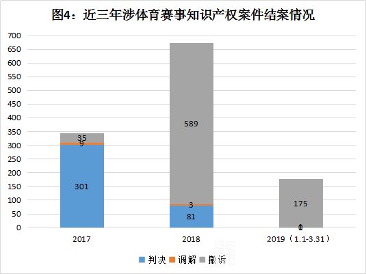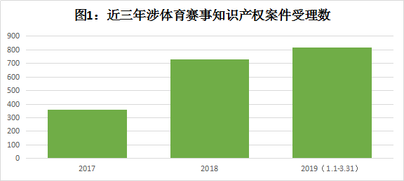 2017年1月1日至2019年3月31日,海淀法院民五庭共受理涉体育赛事知识产权案件1902件,其中,2017年受理357件;2018年受理数量出现激增,达到729件,比2017年上涨了104.2%,而2019年第一季度,受理的案件就已经达到了816件,超过了2018年全年受理案件的总数。