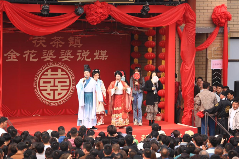 4月21日,泾河新城茯茶镇“金花婆婆说媒”迎来了活动举办以来的第100对牵手成功的青年。在茯茶镇金茯城的舞台上,红色帷幔喜气夺目,每天都有数十对单身的男女青年,登上舞台,勇敢表达;舞台下更是人山人海,氛围火热。