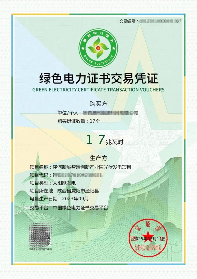 近日,泾河新城新能源发展有限公司472张绿色电力证书成功售出,市场化转型发展迈出关键一步。
