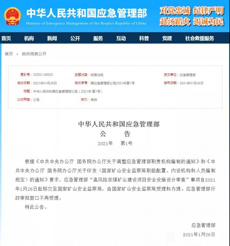 根据《中共中央办公厅 国务院办公厅关于调整应急管理部职责机构编制的通知》和《中共中央办公厅 国务院办公厅关于印发〈国家矿山安全监察局职能配置、内设机构和人员编制规定〉的通知》要求,应急管理部“高风险非煤矿山建设项目安全设施设计审查”事项自2021年1月26日起移交至国家矿山安全监察局,由国家矿山安全监察局受理和办理。应急管理部行政审批窗口不再受理。