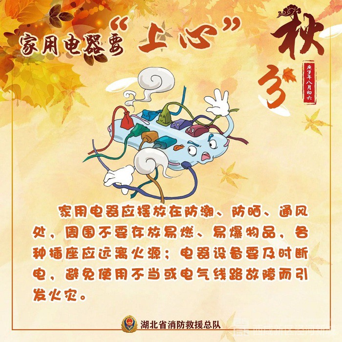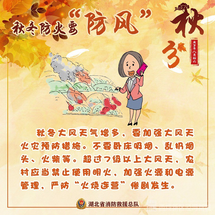 秋季多大风天气,气温寒冷而干燥,居民用火、用电、用气也随之增加,若操作不慎或使用不当,极易引发火灾、漏电等安全事故。秋意渐浓,一起来学习秋季消防安全知识,牢记消防安全在心中。