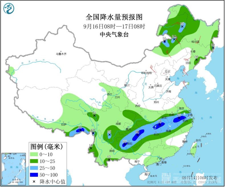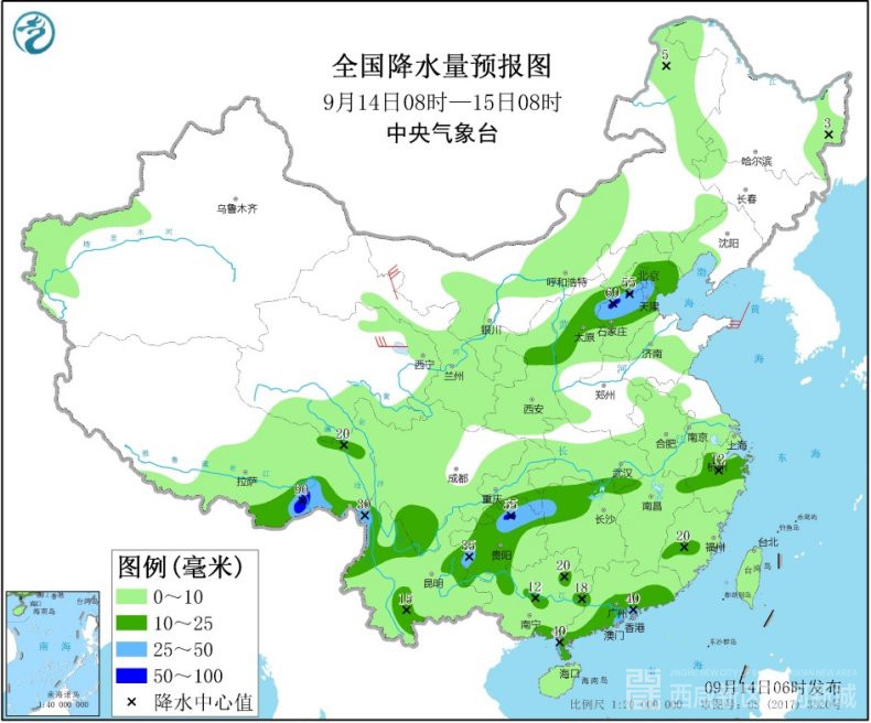 图1 全国降水量预报图(9月14日08时-15日08时)