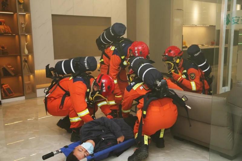 泾河新城消防救援大队联合辖区消防志愿者,在原点国际家居城组织了一场消防安全演练,演练模拟商场一楼某区域发生火灾。发现灾情后,消防安保人员迅速组织顾客和员工撤离,由于现场火势和烟气影响,2名工作人员被困楼内不同区域,消防救援人员积极组织营救,经侦查搜索后分别利用登高平台车、救援担架等装备将被困人员成功救出。
