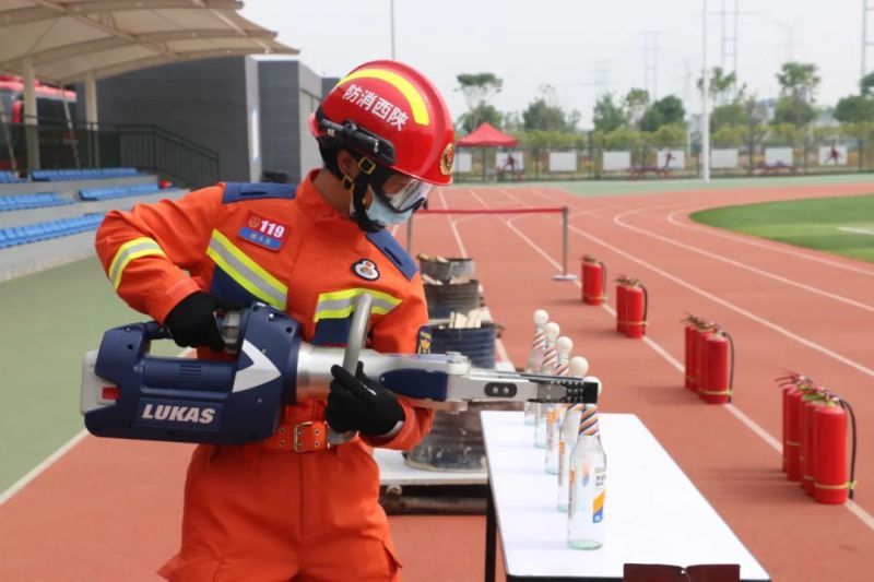在此次活动中,消防宣传员为学生们讲解了液压机动泵组、无齿锯等消防器材的使用方法,表演了灯泡上切钢丝、液压扩张器夹乒乓球等消防技能节目,精彩的表演引来同学们的阵阵尖叫和掌声。同时,消防宣传员根据初期火灾扑救常识,在活动现场仔细教授了灭火器的正确使用方法,并鼓励师生们进行实操体验。同学们一个个跃跃欲试,争先恐后地上前体验,牢牢的将“提、拔、握、压”四字要领熟练掌握。
