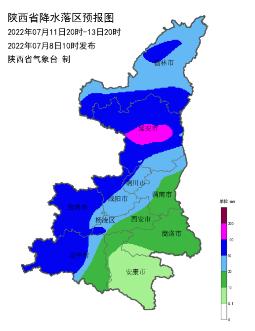 据预报,7月10日夜间到13日,我省中北部、西部有区域性暴雨,局地大暴雨。本次暴雨过程范围广、强度大、持续时间长、极端性强,降水期间伴有短时暴雨或7级以上雷暴大风,小时雨强20~50毫米,局地可达60毫米以上。陕北、关中北部局地日雨量接近或超历史极值,防汛形势严峻。根据《陕西省防汛应急预案》有关规定,省防总已从7月10日22时启动我省IV级防汛应急响应。