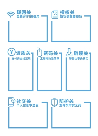 在网络安全越来越受到重视的今天,身处网络之海有哪些注意事项,怎样避防安全风险?免费WiFi须当心,隐私调取应提防,网络支付要核实,密码修改要定期,可疑链接不要点,社交信息少泄露,杀毒软件勤更新……“安全上网 七招助你‘排雷’”特别策划,助推网民提高网络安全意识,更好运用技术和法律武器,携手扎紧网络安全篱笆。